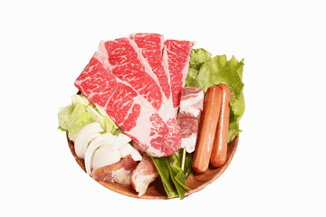 1人前あたり:牛カルビ200g(たれ漬け)・豚バラ串1本・カットモモ60g・ウインナー2本・カット野菜100g・焼きそば -