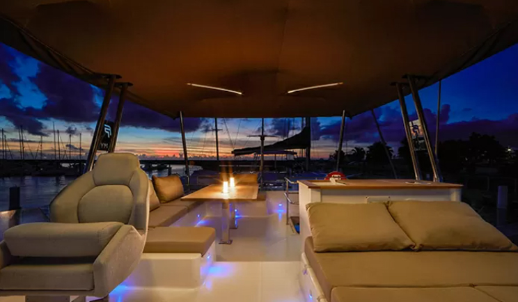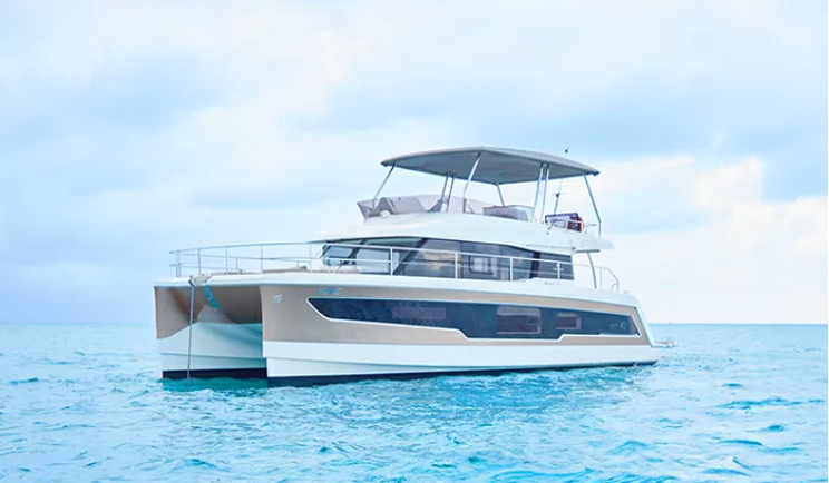 This stunning 3-level, 45-foot (13m) French-made catamaran by Fountaine Pajot offers a dreamlike, elegant experience on the endless blue sea.