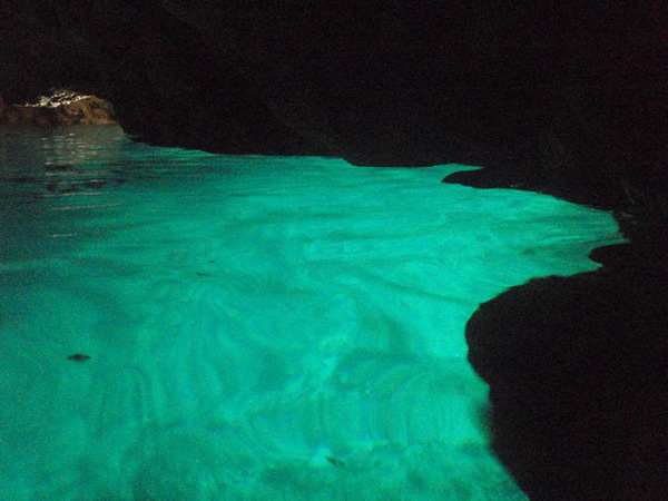 水面の青い光が洞窟内に反射し、美しく神秘的な光景、沖縄版”青の洞窟”後は、ダイビングもお楽しみいただける内容充実ツアー!