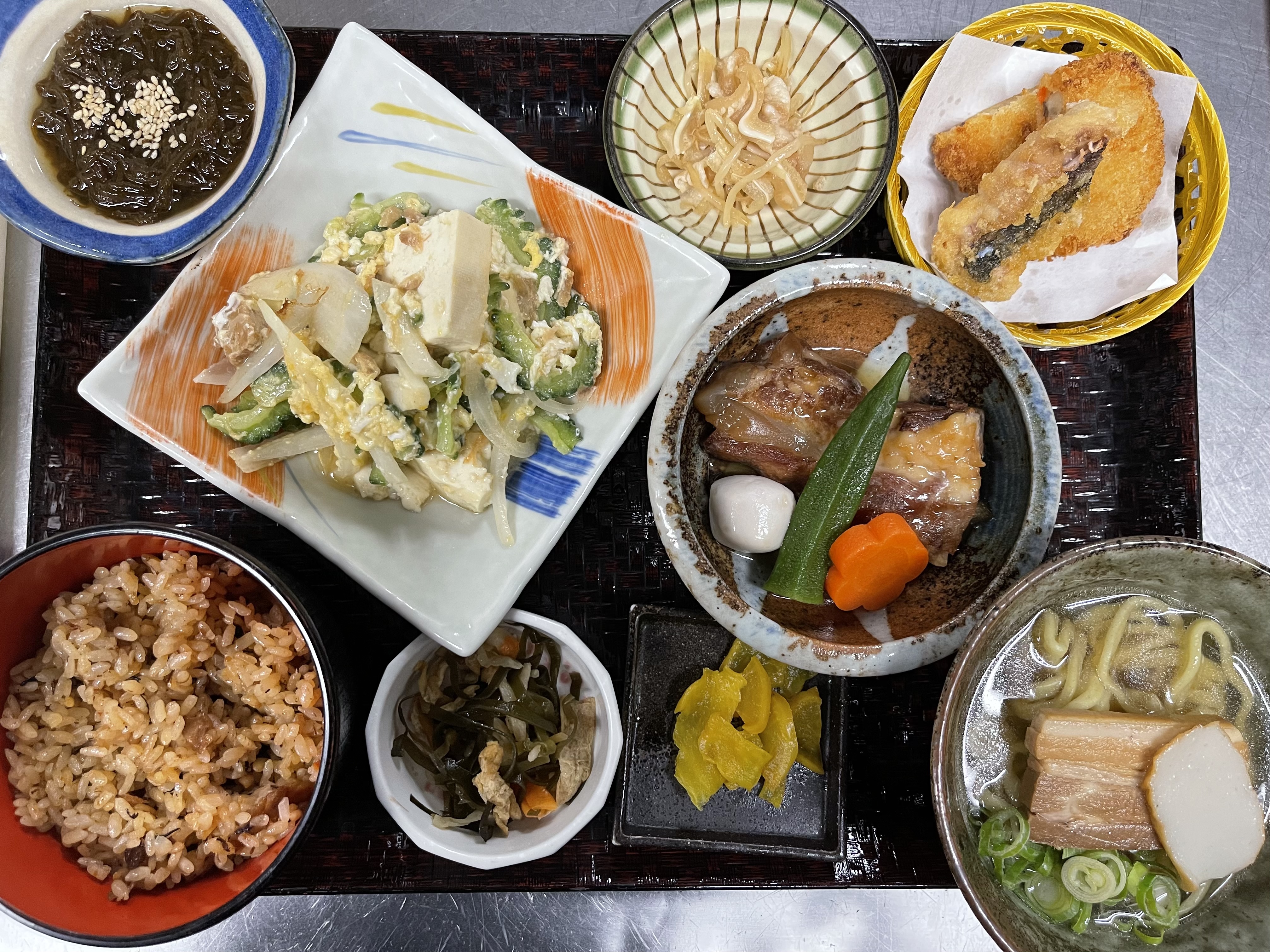 ※「あんがま」or「波照間」お食事内容:もずく酢・ミミガー・クーブイリチー・ゴーチャーチャンプルー・揚げ盛り(グルクン・あぐーコロッケ)・ソーキ煮・ミニ沖縄そば・ジューシー・漬物