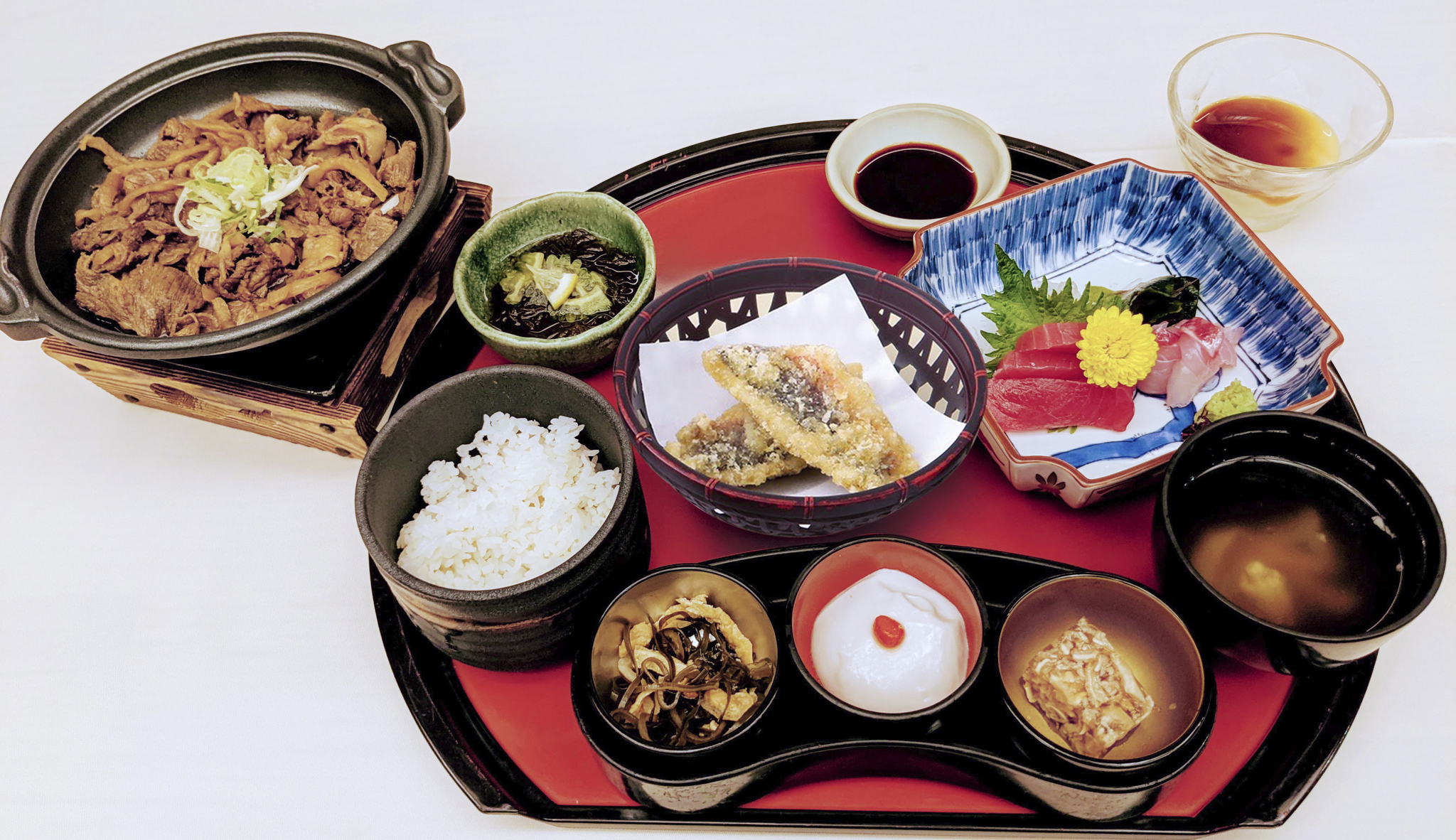 もずく酢・刺身2種盛・ソーキ煮・あぐー陶板煮込み・白米・中味汁・ジーマーミープリン