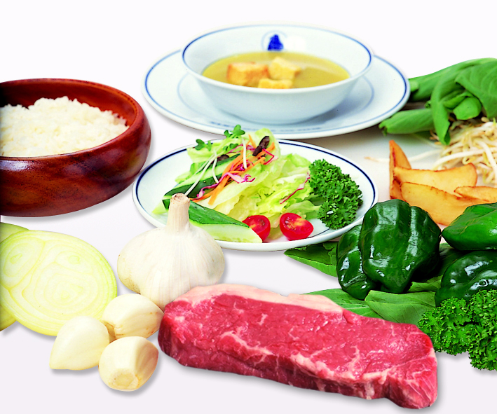 ステーキランチ:サーロインステーキ(150g)、特性スープ、ガーデンサラダ、野菜の鉄板焼き、ライス