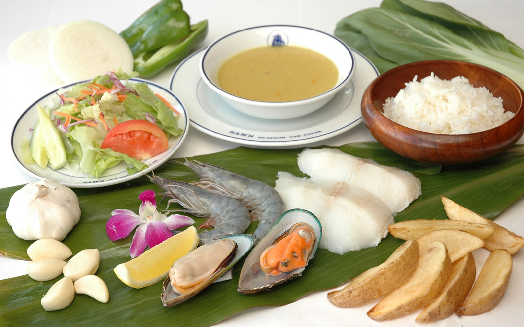 海鮮ランチ:白身魚のうにうに風味、海老、パーナ貝、特性スープ、ガーデンサラダ、野菜の鉄板焼き、ライス