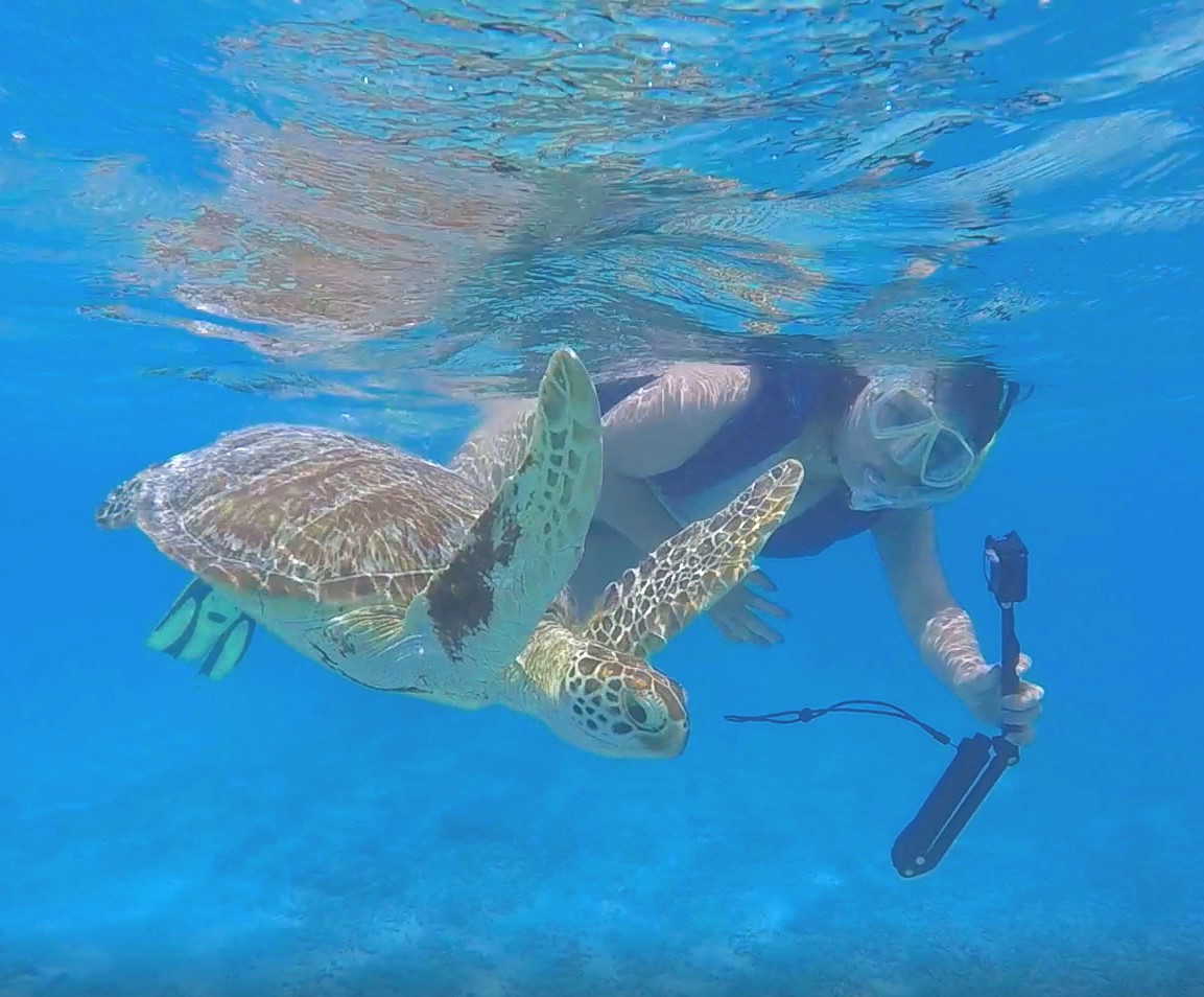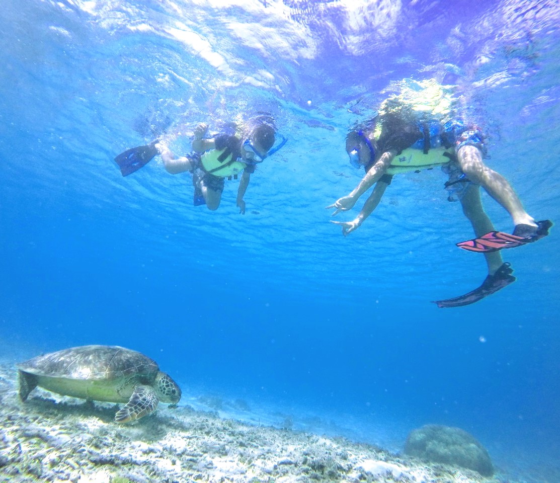 ビーチエントリーのシュノーケリングツアーでは、ウミガメに会える確率はなんと90%![]()