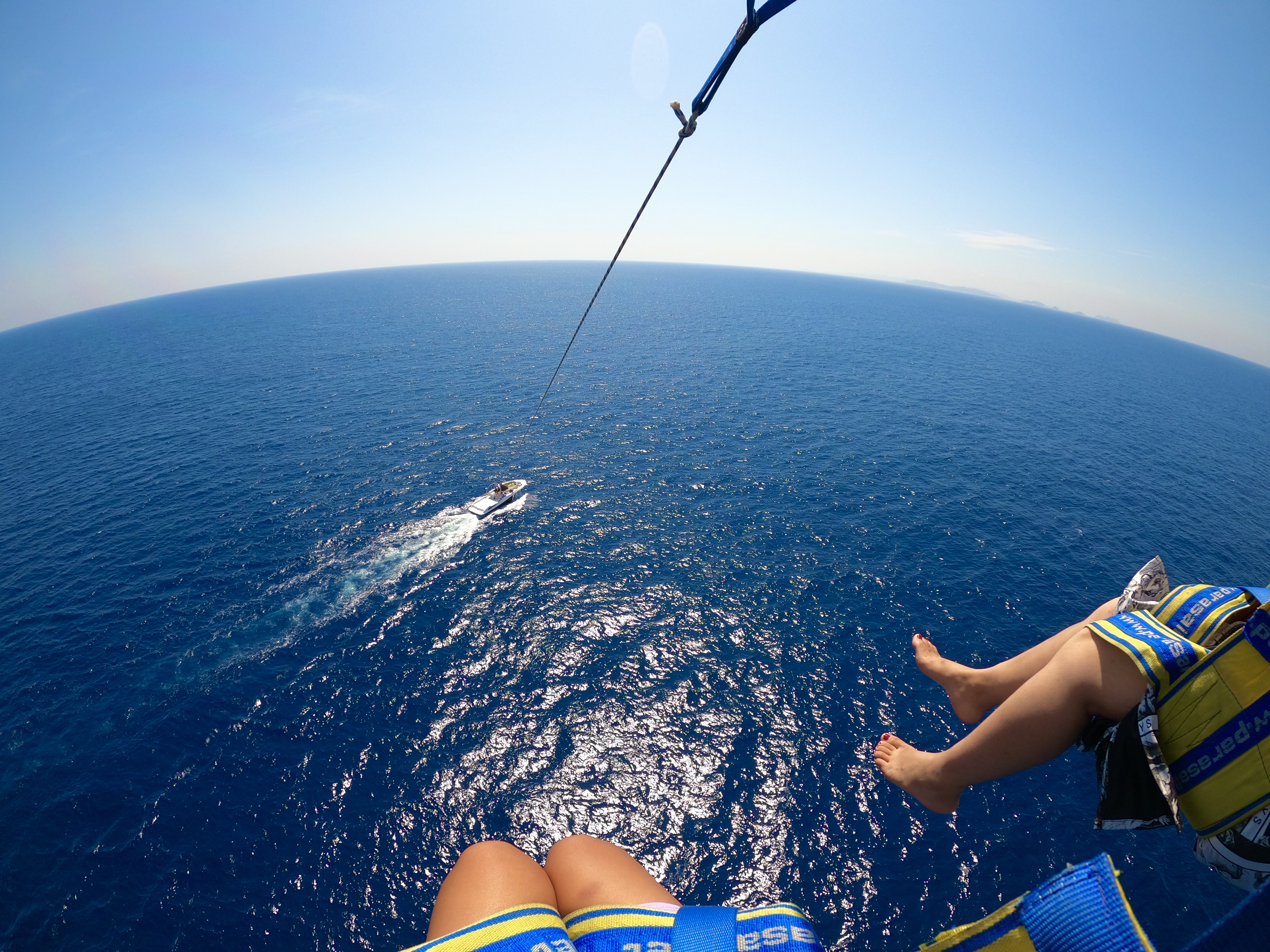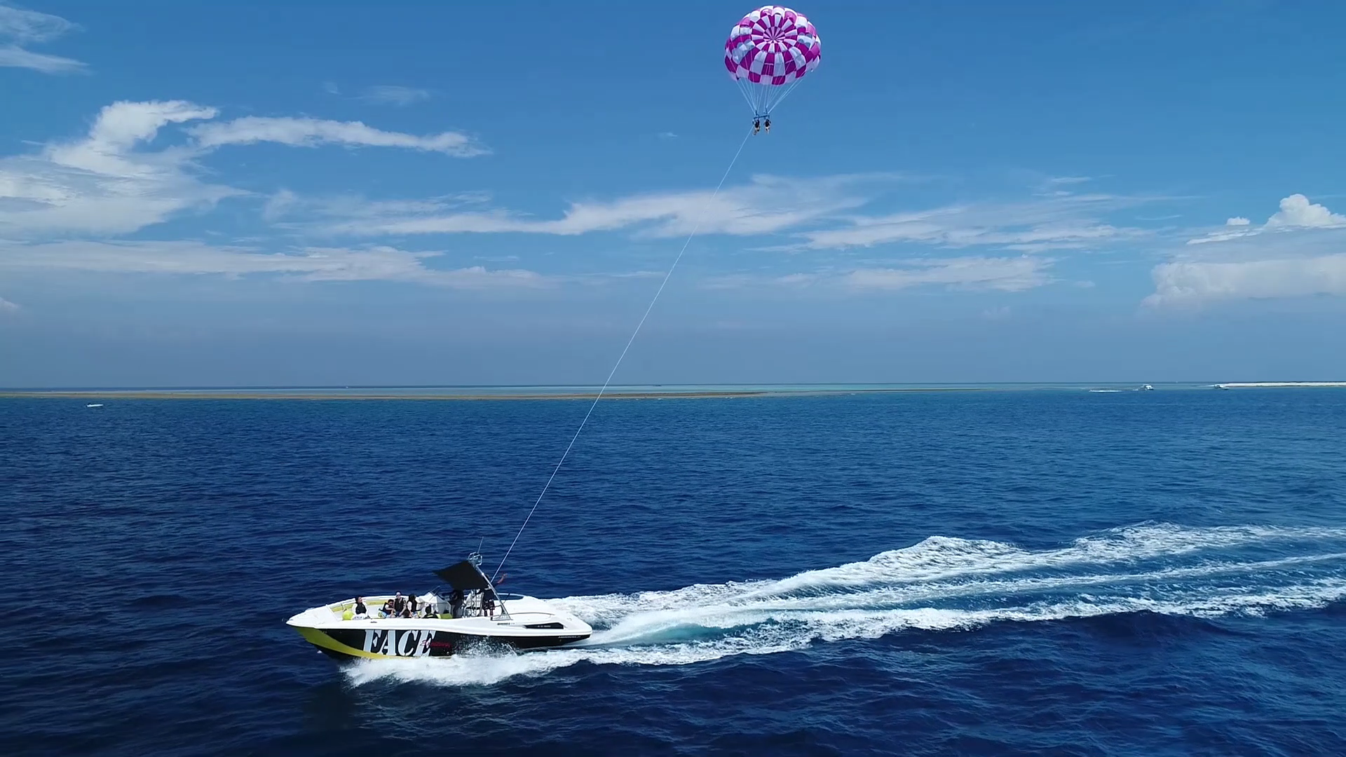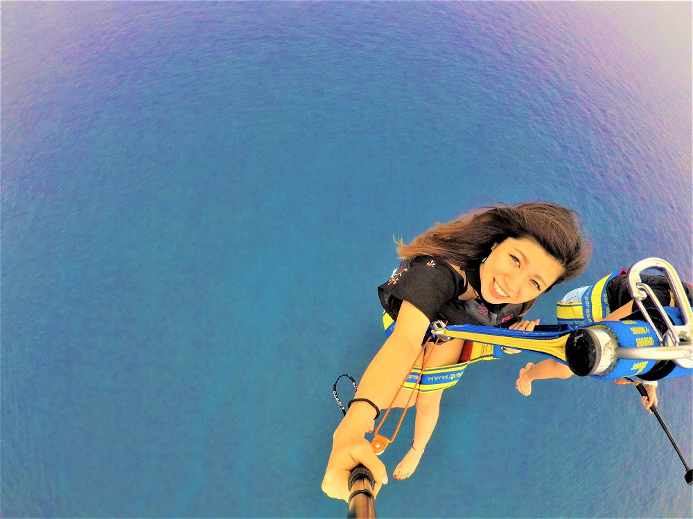パラセーリングで沖縄の風を感じながら、青い広大な海を上空から眺める
