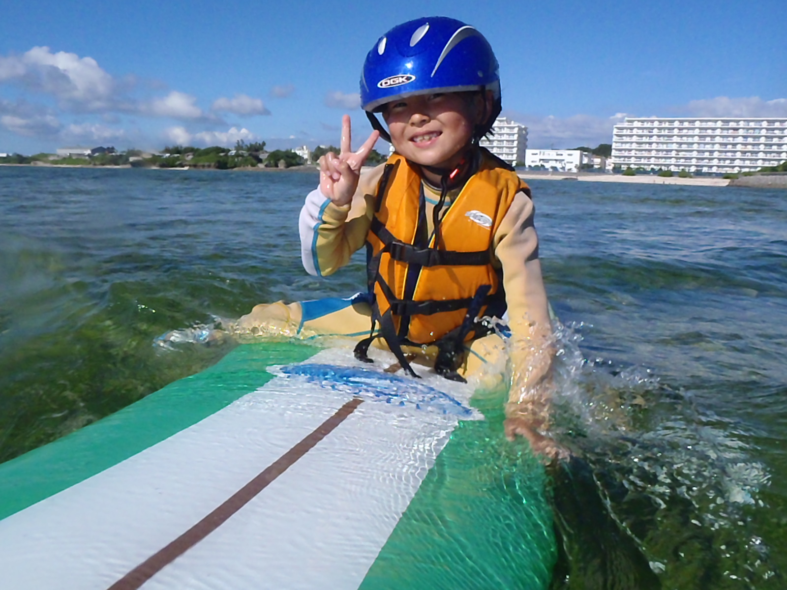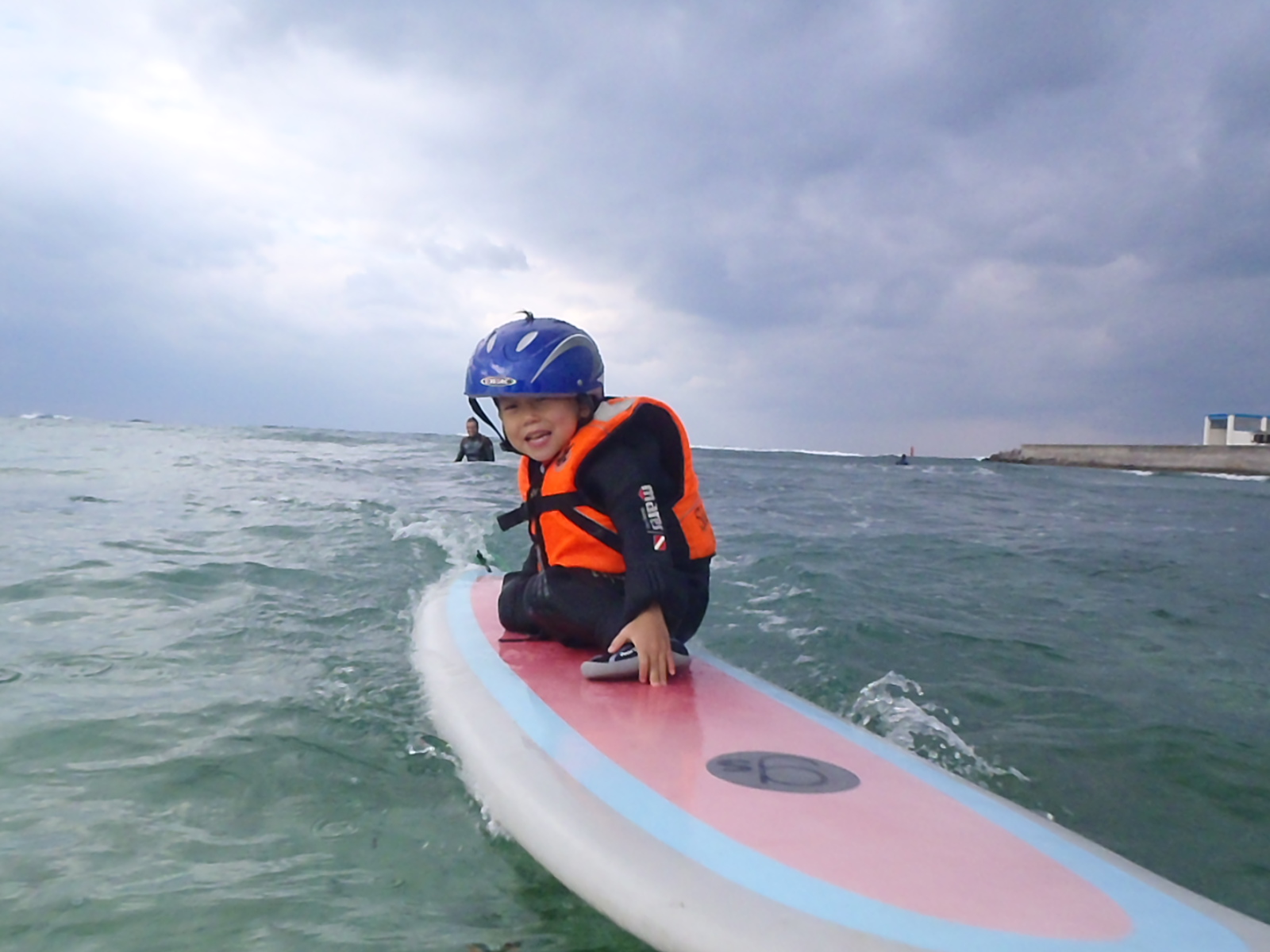通常の水遊びができるお子様なら5歳~ご参加可能です!ライフジャケット着用で、経験豊富なインストラクターが一緒にサーフボードに乗るので安心♪親子でサーフィン体験いかがですか!?