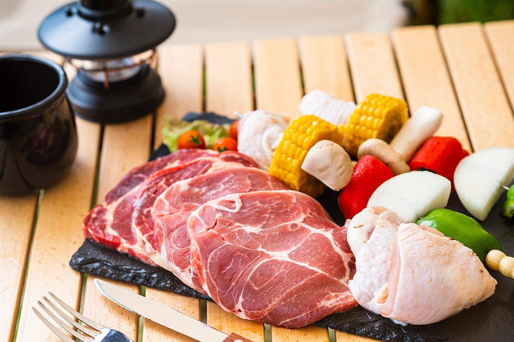 ※BBQ1名あたり:牛肉150g、豚肉100g、鶏肉100g、各種野菜、ウインナー2本、お米0.5合(お飲み物はついておりませんので、お客様ご自身でご準備ください。)