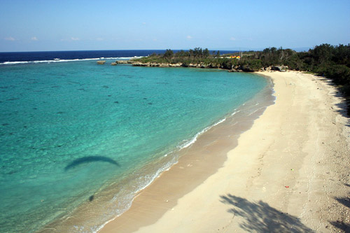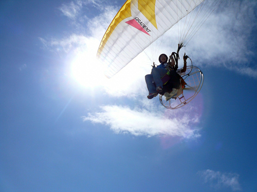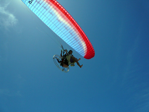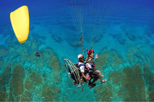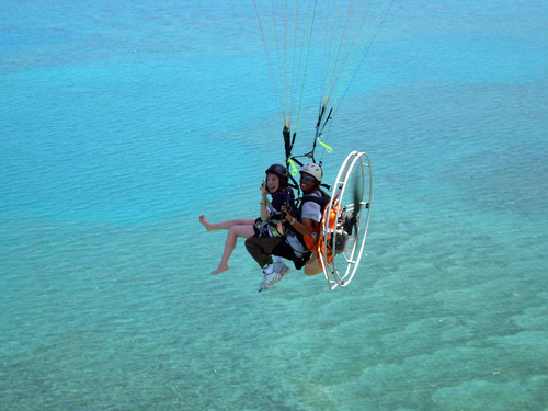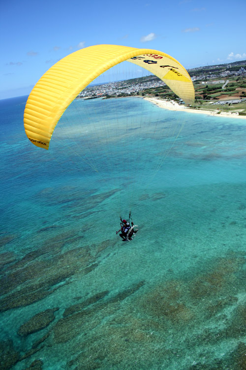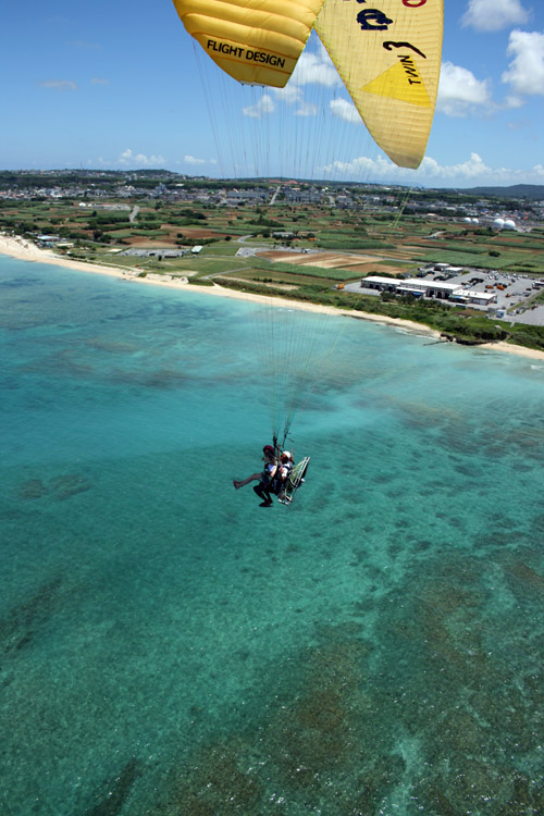 パラグライダーに扇風機のようなエンジンを背負って、ビーチ等の平地から飛び沖縄の素晴らしいサンゴ礁や海の色、白砂が続く海岸線の景色が楽しめます。