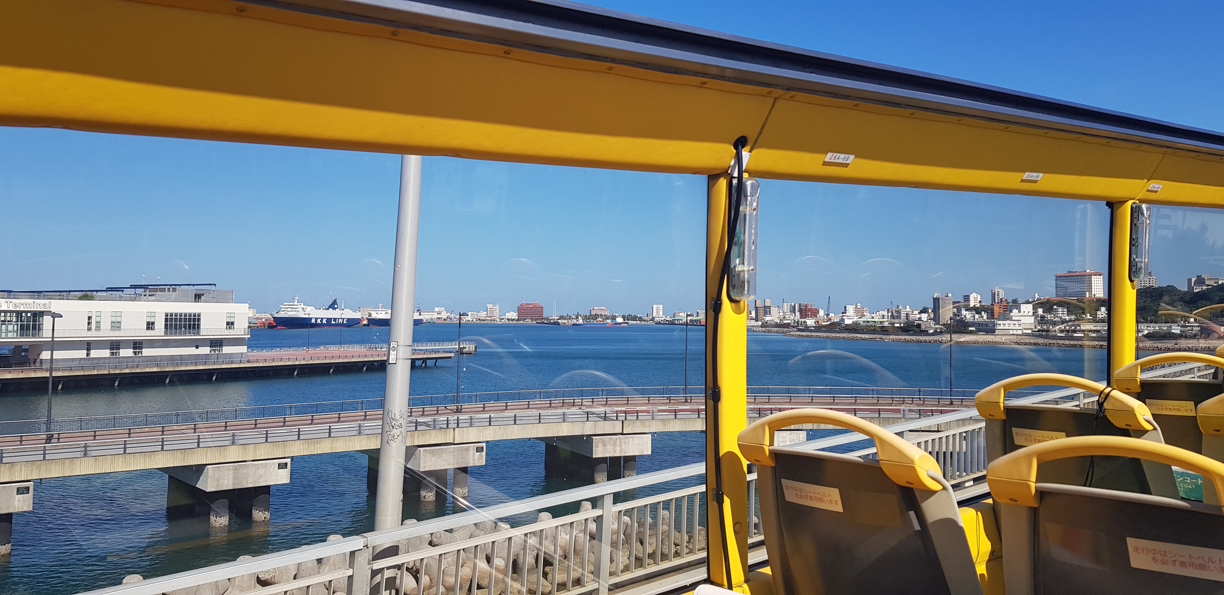 ~車窓をお楽しみください:最大3万人を収容できる県内最大級の野球場「沖縄セルラースタジアム那覇」→運が良ければ巨大な船が見れる「那覇軍港」→那覇市の中心から南西約5kmに位置し、南西防衛区域における唯一の航空基地として重要な役割を果たしている「自衛隊那覇基地」→本島と瀬長島を結び、飛行機のビュースポットとして有名な「瀬長島海中道路」~