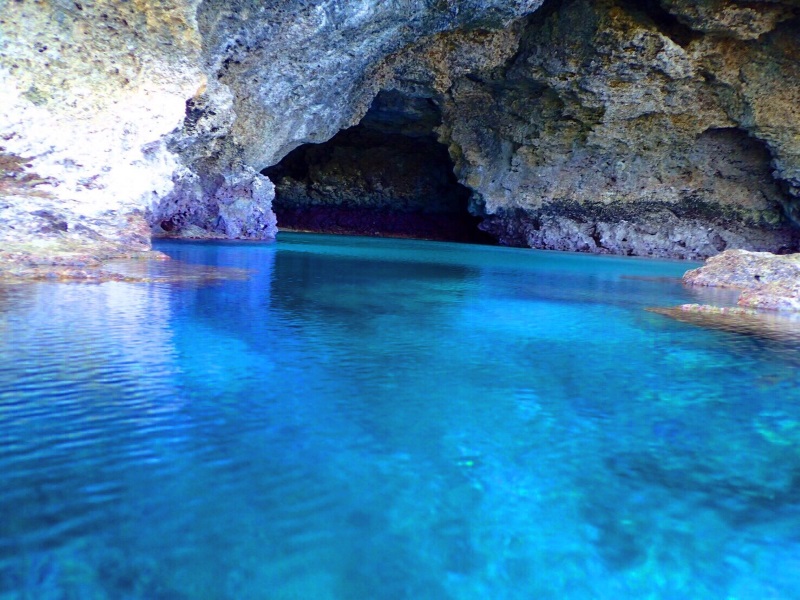 水面の青い光が洞窟内に反射し、美しく神秘的な光景、沖縄版”青の洞窟”後は、お魚にエサをあげながらシュノーケリングもお楽しみいただける内容充実ツアー♬
