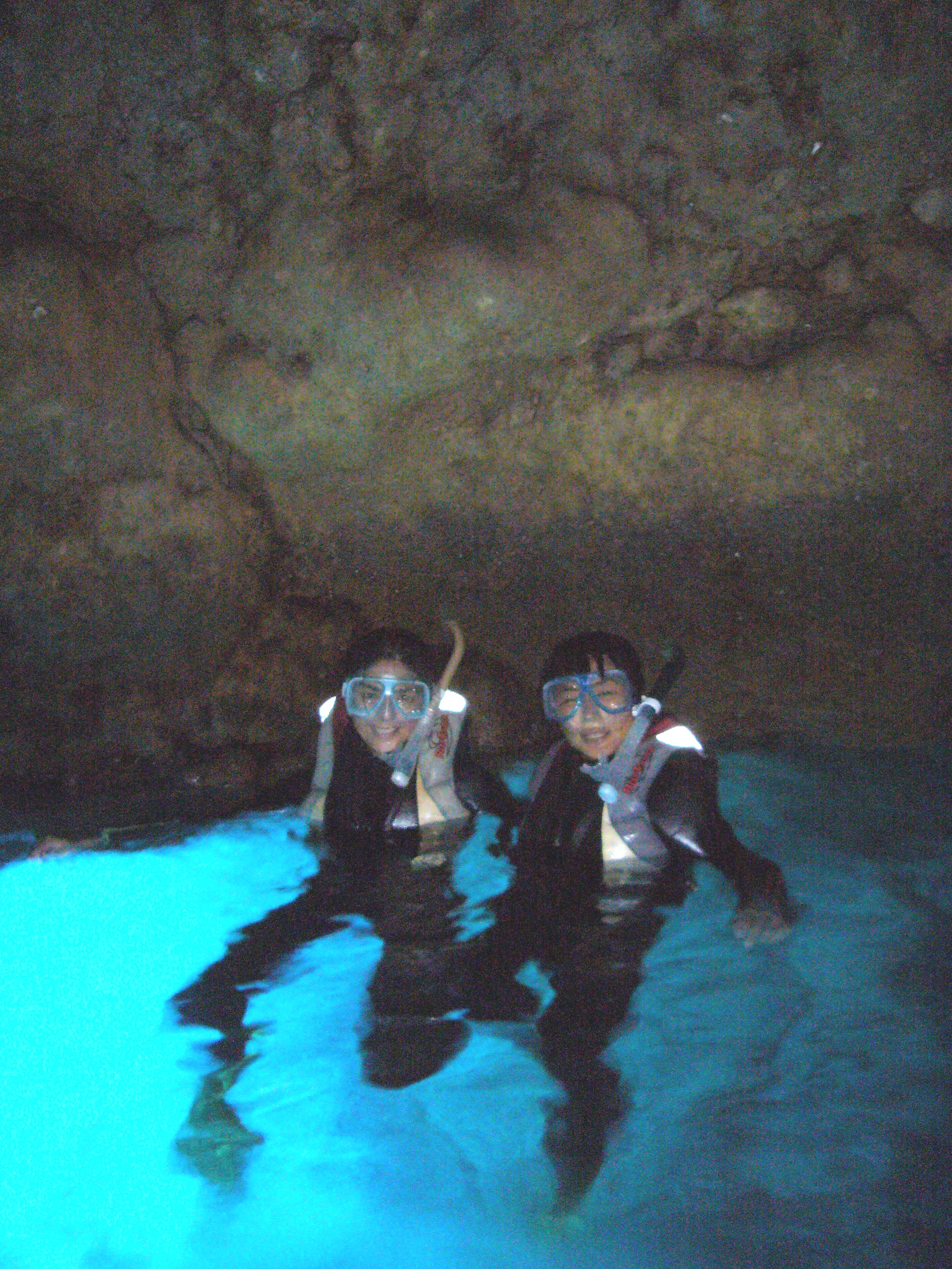 水面の青い光が洞窟内に反射し、美しく神秘的な光景、沖縄版”青の洞窟”後は、洞窟の近くでシュノーケリングもお楽しみいただける内容充実ツアー♬